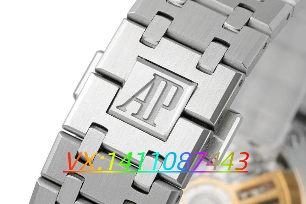 裝配精度是影響佩戴體驗與外觀質感的關鍵。在表圈裝配方面,DDF廠此款腕表的八角形表圈與表殼主體貼合緊密,縫隙均勻,無左右偏移現象,表圈上的六邊形螺絲孔位精準,進口高光螺絲安裝后與表圈平面平齊,無凸起或凹陷情況。表帶裝配同樣可圈可點,鋼帶采用漸變厚度設計,從表耳到表扣由厚到薄過渡流暢,每節表鏈連接緊密,開合靈活,無卡頓現象。表扣部分的雕刻細節清晰,“AP”logo精雕細琢,開合手感順滑,扣合后鎖定牢固,無松動風險。不過實測發現,部分樣品存在計時按鍵與表殼貼合度稍差的情況,按壓時存在輕微晃動,屬于裝配環節的小瑕疵。